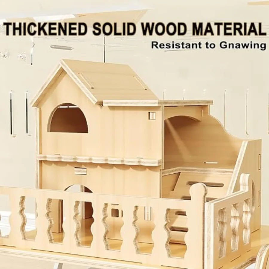 【Including All Accessories】 The hamster house is fully functional, including a European-style wooden house, a food bowl, stairs, an 18cm oversized silent running wheel, an arch bridge toy, an external bathing area and a water bottle with a steel ball inside to prevent leaks. Provides plenty of room for hamsters to dig and play. This is definitely a comfortable hamster habitat .