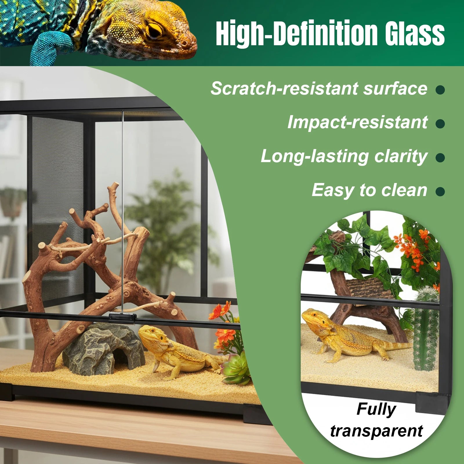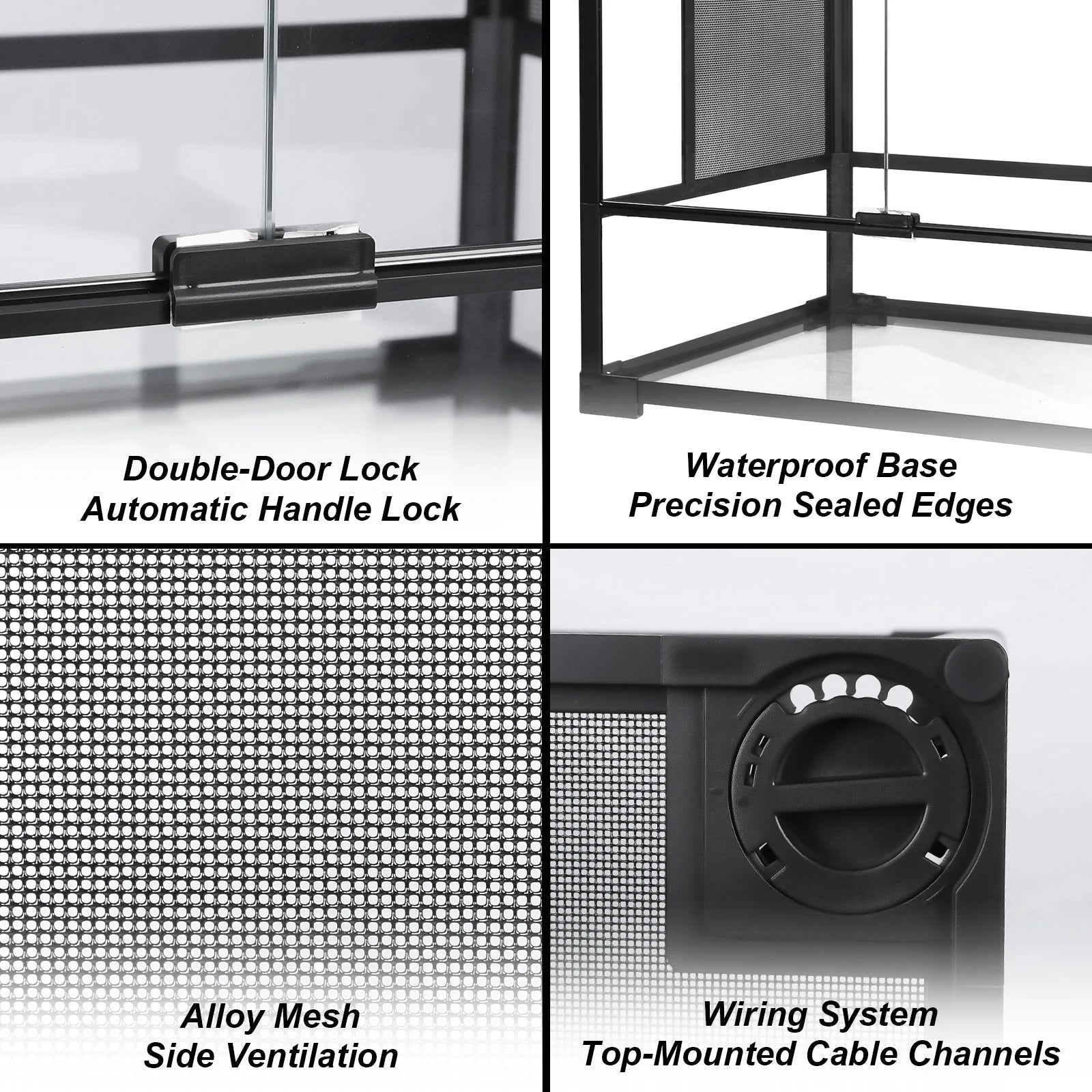 Glass Reptile Terrarium Top Screen Ventilation Reptile Enclosure Front Opening Habitat Enclosure Side Mesh Ventilation for Leopard Geckos Snakes Tree Frogs Features: 1.High-Quality Material: This tempered glass reptile tank is built with premium materials that ensure sturdiness and safety for your pet. 2.Removable Mesh Top Screen: The top screen of the habitat enclosure provides ample airflow and permits full-spectrum, UVB, and IR light penetration. 3.Convenient Front Doors: Front doors can be opened separately for easy feeding, cleaning, decorating, or maintenance. The reptile enclosure includes a secure lock to prevent escape. 4.Raised Bottom Frame Design: This glass reptile terrarium features an elevated base for heat pad placement and even heat distribution. Waterproof bottom makes it suitable as both desert and rainforest habitation. 5.Easy Installation and Transport: This reptile tank is detachable, allowing for quick setup or takedown in minutes with step-by-step instructions. Securely packed with reinforced foam for hassle-free transportation. Specification: Product size: 60*45*60cm Material quality: Steel alloy + Alloy glass + Glass Applicable snake, lizard, crab, cross-colored dragon, dragonfly, horned frog, dragon rat, morimiya, etc. Note: