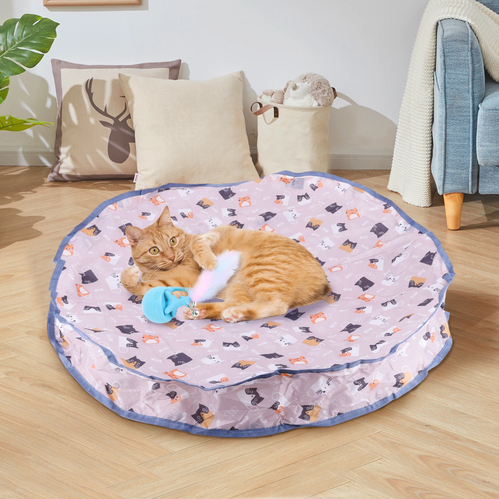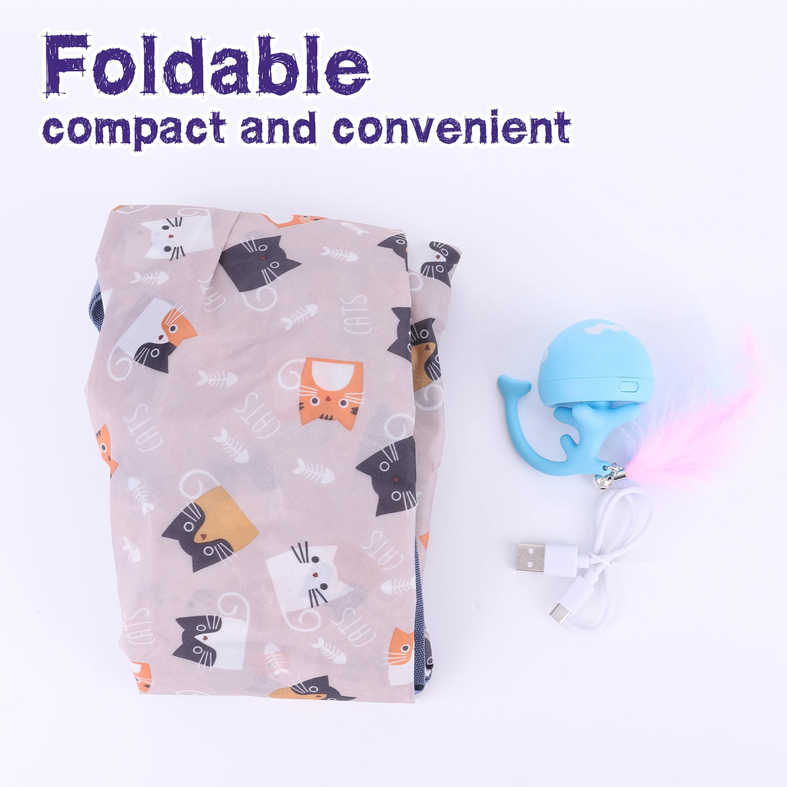 Features: 1.Interactive Cat Toy: The automated cat ball rolls inside a bag, enticing your kitten to pounce, scratch, catch, bite, and hunt during indoor games. The upgraded thickened edges prevent crumpling when attacked by cats and help the ball roll smoothly inside. 2.Motion Activate Chirping Cat Toy: The pet touchball (not the bag) awakens the motion activate chirping cat toy. After 10 minutes of play, the ball enters standby mode, but your cat can awaken the game again by slapping the rolling ball. 3.Mouse Catching Game: The interactive cat toy with chirping bird sounds, it attracts your kitten's interest in the dark. At night, LED lights flash, and your cat will love the moving object under cover, simulating bird calls for more attention. Quickly press the button twice to turn the LED light on/off. 4.Cat Mat Toy: In interactive mode, the cat mat toy only activates when the cat pats it, making responsive interactions highly engaging. The rechargeable cat ball comes with a Type C cable and fully charges within 2-3 hours using a 5V/1A adapter. 5.Automated Cat Hunting Toy: A cover plus interactive cat ball create a play garden for energetic cats. Additionally, when placing the mouse catching game on the floor, your kitten may chase it around the room an ideal gift for festivals or any day! Specification: Product cover diameter: 70cm/27.3in Material: ABS, silicone, TPR Ball diameter: 50mm/1.95in Note: